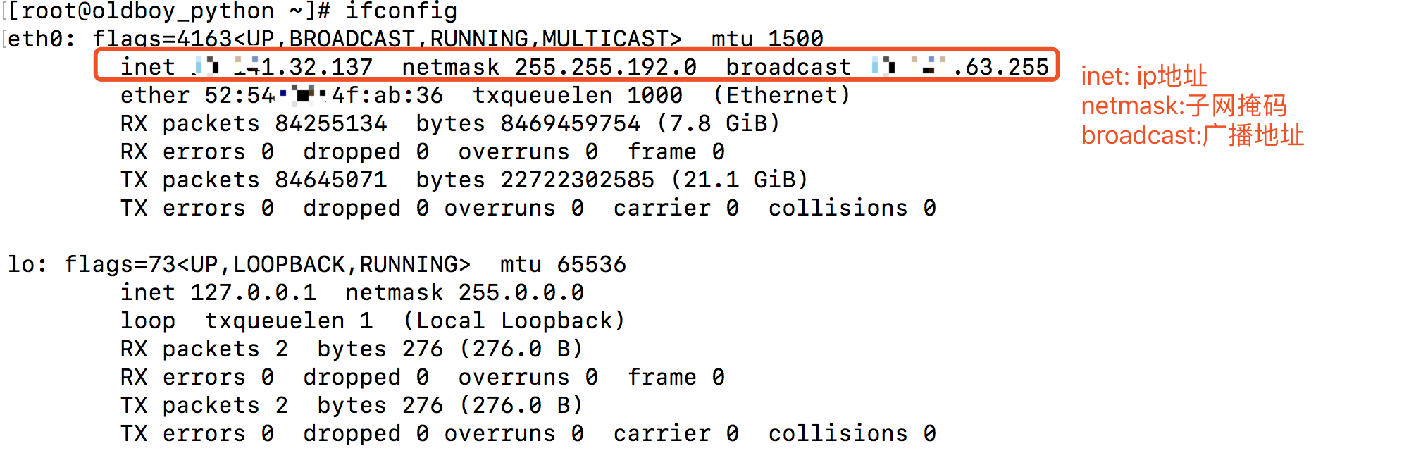 直接输入ifconfig会列出已经启动的网卡,也可以输入ifconfig eth0单独显示eth0的信息