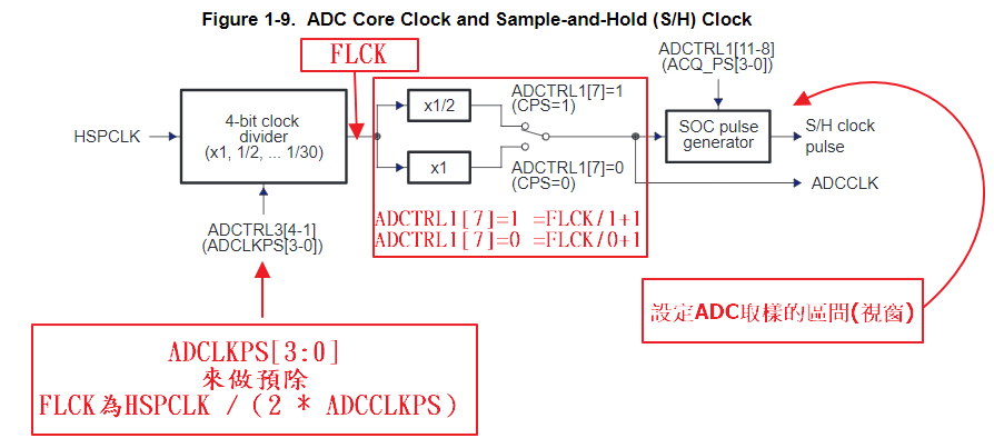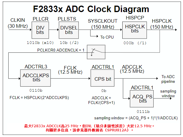 以25MHZ為ADCCLK為例,ACQ_PS=0的話 採樣視窗為0+1=1個(只有含HIGH的視窗),故採樣率的部分要25MHZ/1+1=12.5MHZ