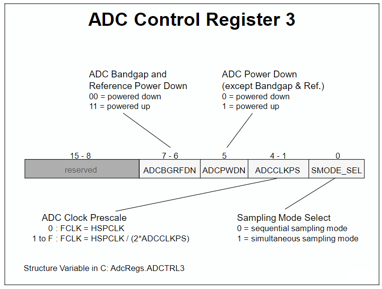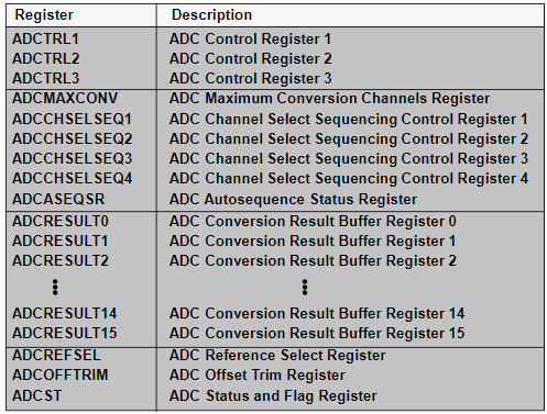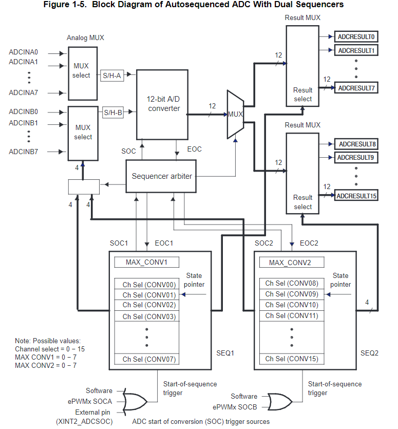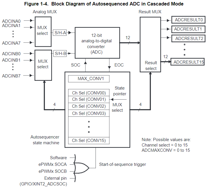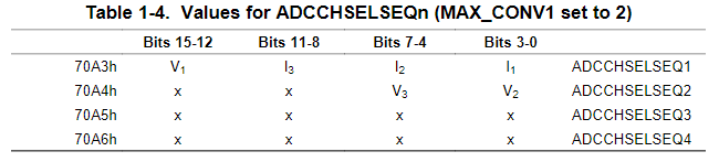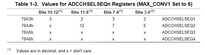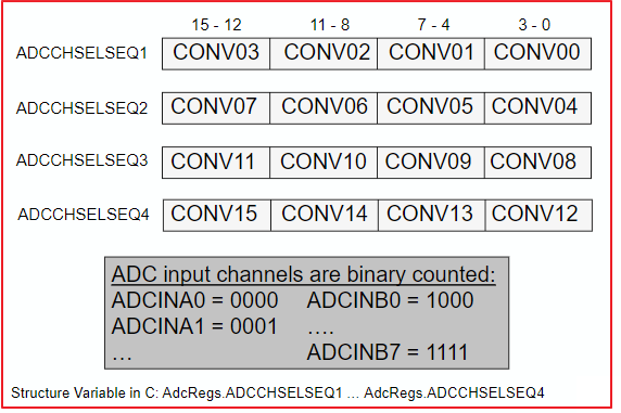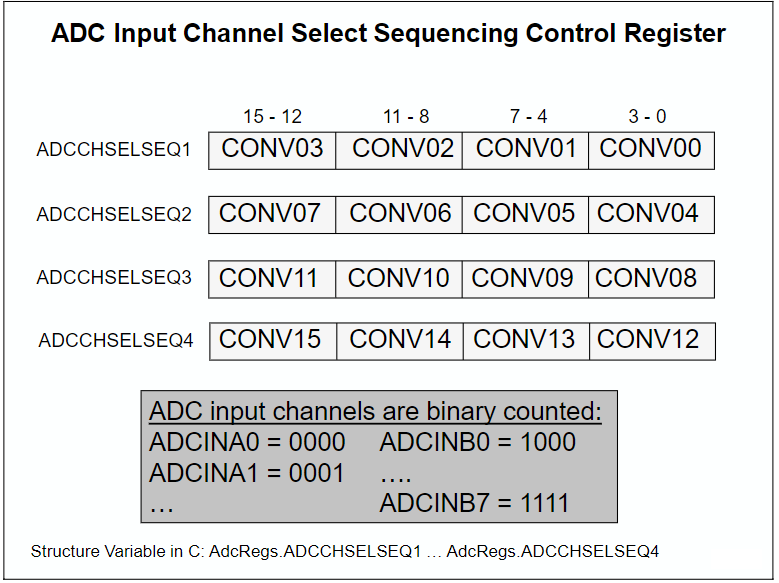 四個寄存器組ADCCHSELSEQ1 ... 4用於通過十六個4位組CONV00 ... CONV15指定輸入通道ADCINA0 ... ADCINB7的二進制數