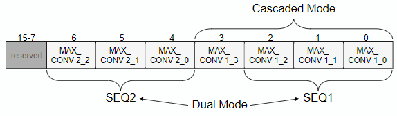 如果我們使用“雙音序器模式”,寄存器MAXCONV的解釋稍有改變。在此模式下,位0至2用於指定序列發生器SEQ1中的轉換次數,而位4至6用於SEQ2。回想一下,在這種模式下,每個音序器的最大轉換次數為8次,因此MAXCONV中的限制為3個位。