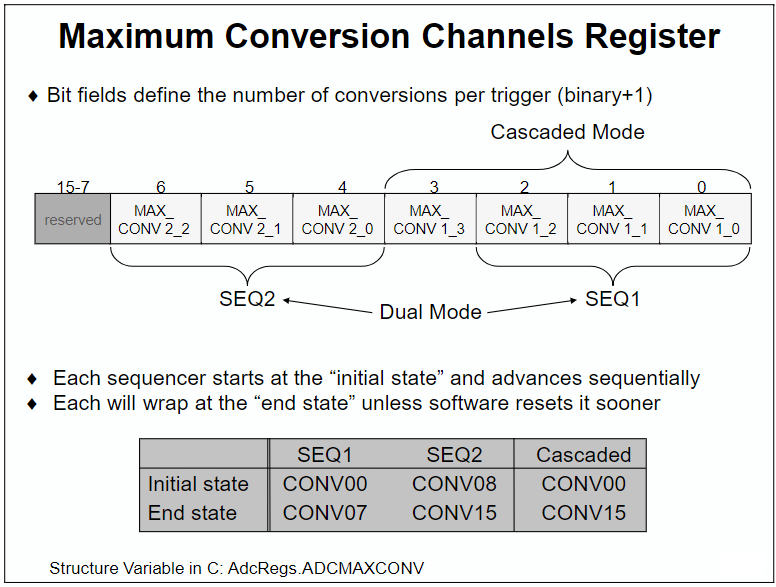 假如要用SEQ1做7個輪序轉換(例如在自動輪序期間,通道2、3、2、3、6、7、12需要被轉換),則ADCMAXCONV.all=0x006 (6+1=7)