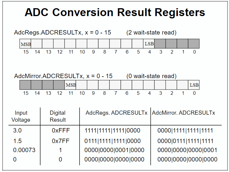 轉換完成後,寄存器RESULT0將包含ADCINA4的值,並將RESULT1寄存器中ADCINB4的值