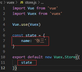 我们在state中定义属性name,给一个初始值 “张三”;在store实例中注册state;在组件中使用$store.state.name使用定义的属性name
