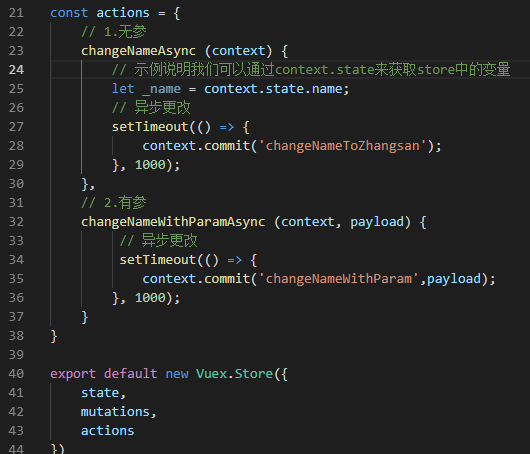 上面在mutation的介绍中我们提到了,mutation中规则上是不允许异步操作的,那如果我们需要异步的进行更改状态怎么办?于是vuex为我们提供了action。