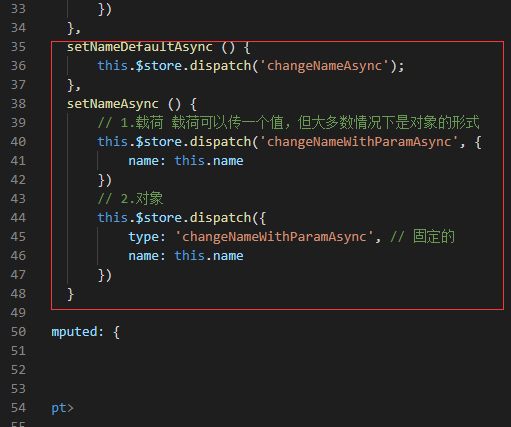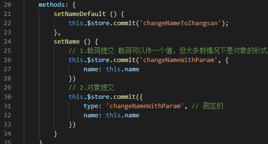在示例组件的methods中,我们定义了两个方法,一个是调用无参的mutation方法,一个是调用带参的mutation方法(包含两种方式【载荷】、【对象】)