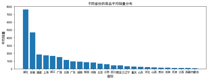 plt.title('不同省份的商品平均销量分布',fontsize=12)