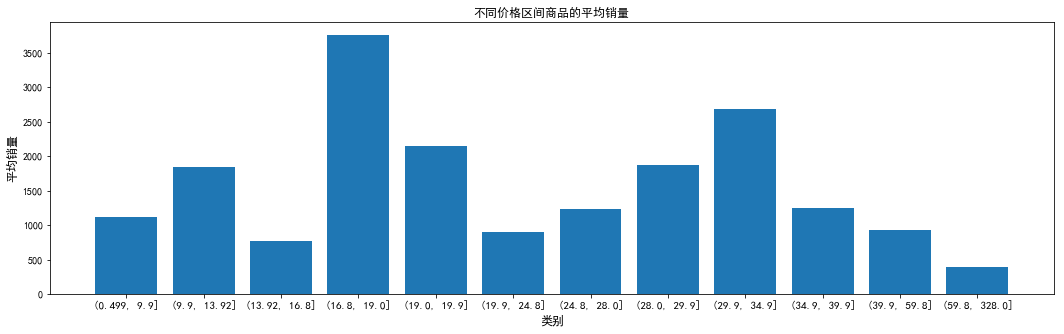 plt.title('不同价格区间商品的平均销量',fontsize=12)