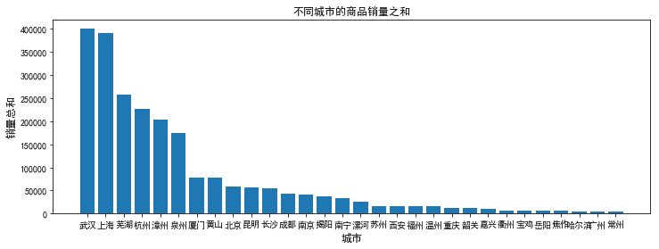 plt.title('不同城市的商品销量之和',fontsize=12)