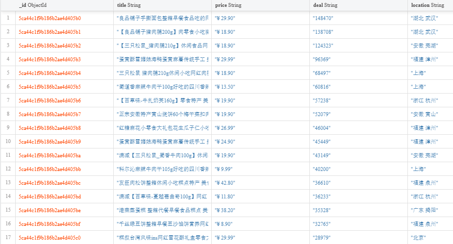 注意:运行程序后会弹出淘宝登陆页面,使用手机淘宝扫描登陆,然后坐等爬取结果,最后从MongoDB中导出CSV文件即可。