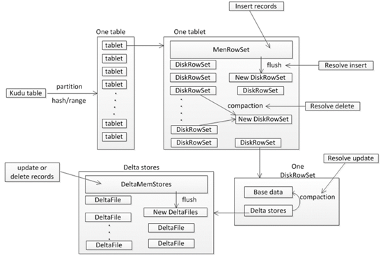 (注意:memRowSet是行式存储,DiskRowSet是列式存储,MemRowSet基于primary key有序)。每隔tablet中会定期对一些diskrowset做compaction操作,目的是对多个diskRowSet进行重新排序,以此来使其更有序并减少diskRowSet的数量,同时在compaction的过程中慧慧resolve掉deltaStores当中的delete记录