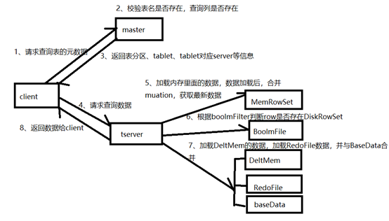 客户端将要读取的数据信息发送给master,master对其进行一定的校验,比如表是否存在,字段是否存在。Master返回元数据信息给client,然后client与tserver建立连接,通过metaData找到数据所在的RowSet,首先加载内存里面的数据(MemRowSet与DeltMemStore),然后加载磁盘里面的数据,最后返回最终数据给client.