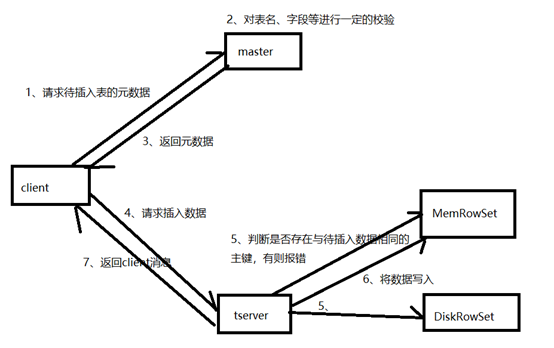 Client首先连接master,获取元数据信息。然后连接tserver,查找MemRowSet与DeltMemStore中是否存在相同primary key,如果存在,则报错;如果不存在,则将待插入的数据写入WAL日志,然后将数据写入MemRowSet。