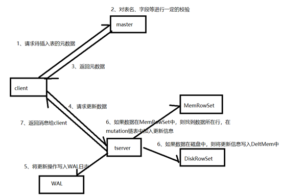 Client首先向master请求元数据,然后根据元数据提供的tablet信息,连接tserver,根据数据所处位置的不同,有不同的操作:在内存MemRowSet中的数据,会将更新信息写入数据所在行的mutation链表中;在磁盘中的数据,会将更新信息写入DeltMemStore中。