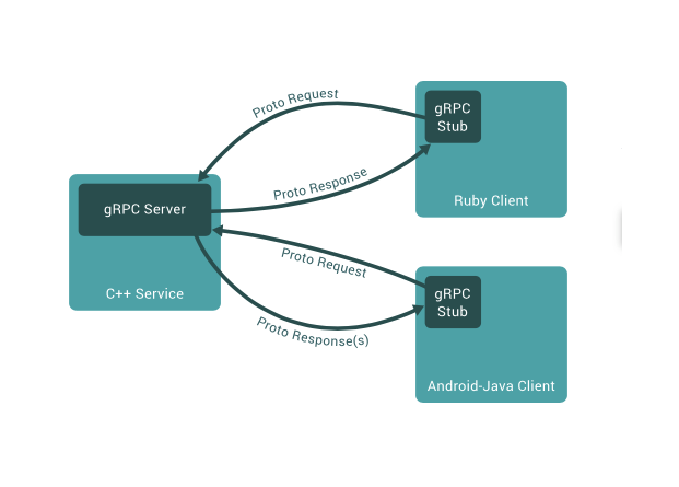 gRPC服务端使用C++构建,客户端可以使用Ruby或者Java构建,客户端通过一个Stub存根(代理)对象发起RPC调用,请求和响应消息都使用Protocol Buffer进行序列化。