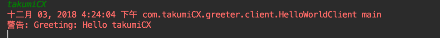 ###3.6 测试 先启动gRPC服务端,然后启动gRPC客户单。客户端发送gRPC请求takumiCX,收到了来自服务端的响应Hello takumiCX