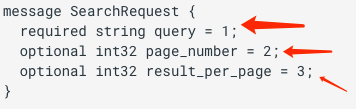 optional int32 result_per_page = 3 [default = 10];该字段的值有0个或1个,传入多个将报错。且以optional修饰的字段可以设置默认值,若没有设置,则编译器会根据类型自动设置一个默认值,比如string设置为空字符串,bool类型设置为false等。 -