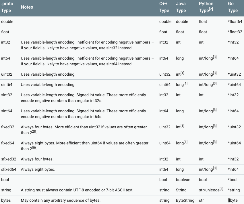 基本数据类型 int32表示java中的int,int64表示java中的long,string表示java中的string,具体的对应关系如下表所示