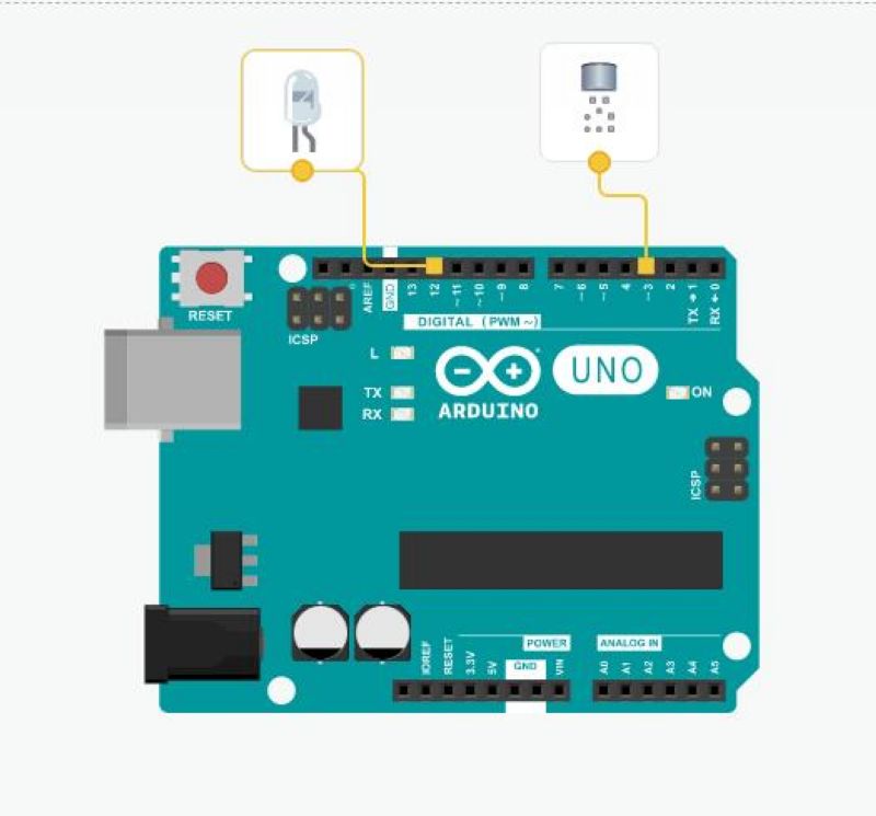 实验思路——声音感应器模块DO端,接到Arduino uno数字口3脚,当环境声音强度达不到设定阈值时,DO输出高电平,12脚LED低电平灯灭;当环境声音强度超过设定阈值时,DO输出低电平,12脚LED高电平灯亮。