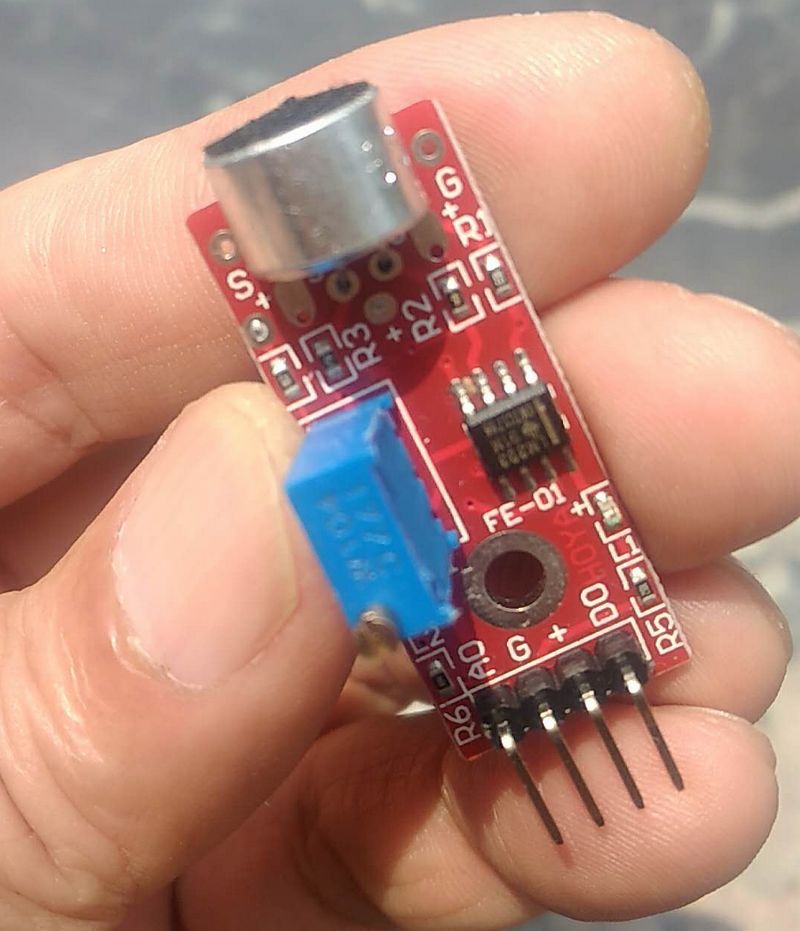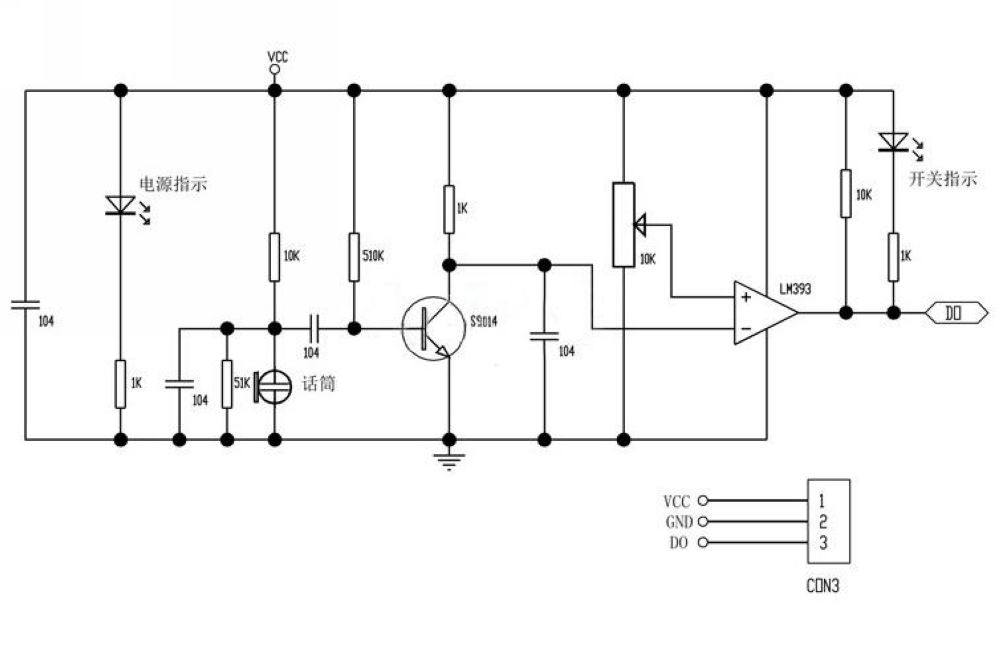2、DO,当声音强度到达某个阀值时,输出高低电平信号【阀值-灵敏度可以通过电位器调节】