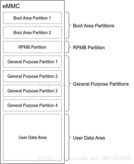 从下图可以看出来,分为四个区Boot Area Partitions、RPMB Partition、General Purpose Partitions和User Data Area。