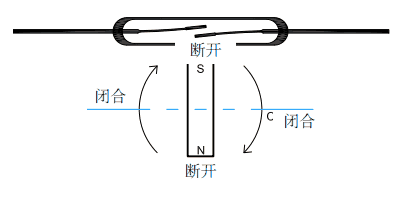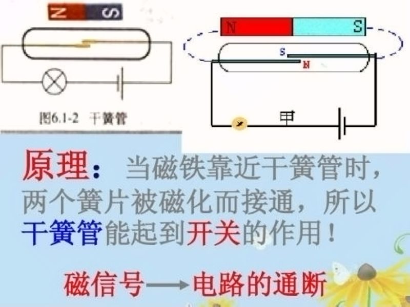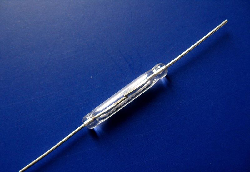 干簧管是干式舌簧管的简称,是一种有触点的无源电子开关元件,具有结构简单,体积小便于控制等优点,其外壳一般是一根密封的玻璃管,管中装有两个铁质的弹性簧片电板,还灌有一种叫金属铑的惰性气体。平时,玻璃管中的两个由特殊材料制成的簧片是分开的。当有磁性物质靠近玻璃管时,在磁场磁力线的作用下,管内的两个簧片被磁化而互相吸引接触,簧片就会吸合在一起,使结点所接的电路连通。外磁力消失后,两个簧片由于本身的弹性而分开,线路也就断开了。因此,作为一种利用磁场信号来控制的线路开关器件,干簧管可以作为传感器用,用于计数,限位等等(在安防系统中主要用于门磁、窗磁的制作),同时还被广泛使用于各种通信设备中。在实际运用中,通常用永久磁铁控制这两根金属片的接通与否,所以又被称为“磁控管”。