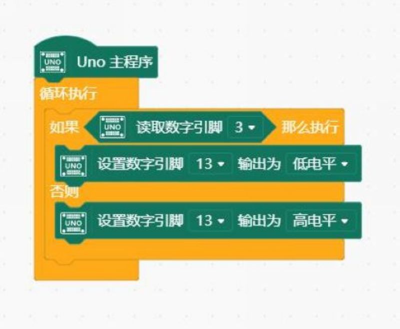 干簧管模块和数字13接口的LED 搭建简单电路,制作磁场提示灯。利用数字13接口的LED,将干簧管传感器模块接入数字3接口,当作磁场传感器,检测到有磁场信号时,LED 亮,反之则灭。