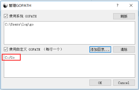 打开 管理GOPATH 对话框,添加C:\Go目录到 使用自定义 GOPATH中: