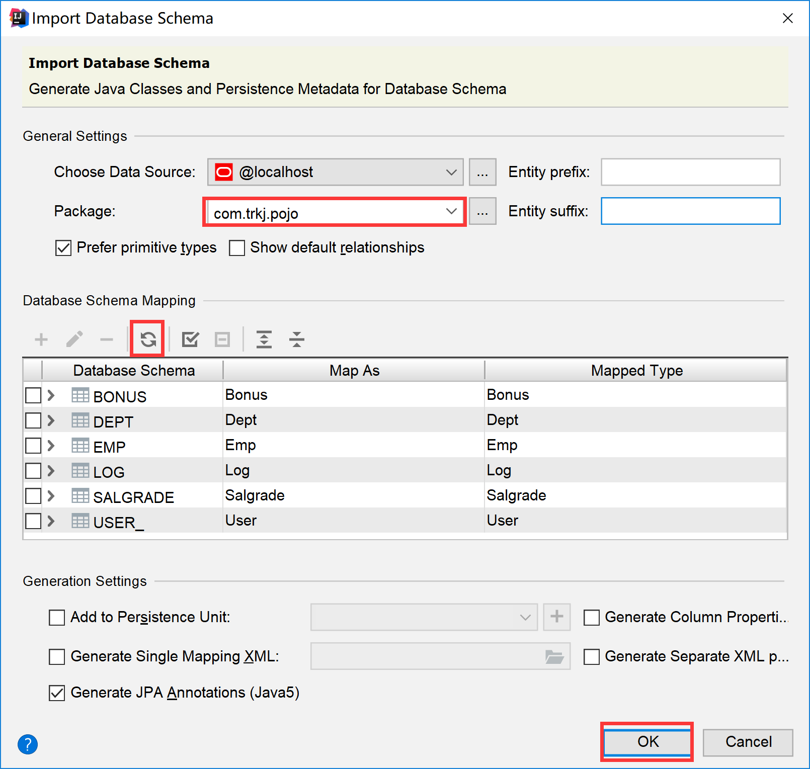 选择我们刚才创建的Data Source,选择实体类生成在哪个包里,如果你需要在实体类名称添加前缀或后缀,也可以配置