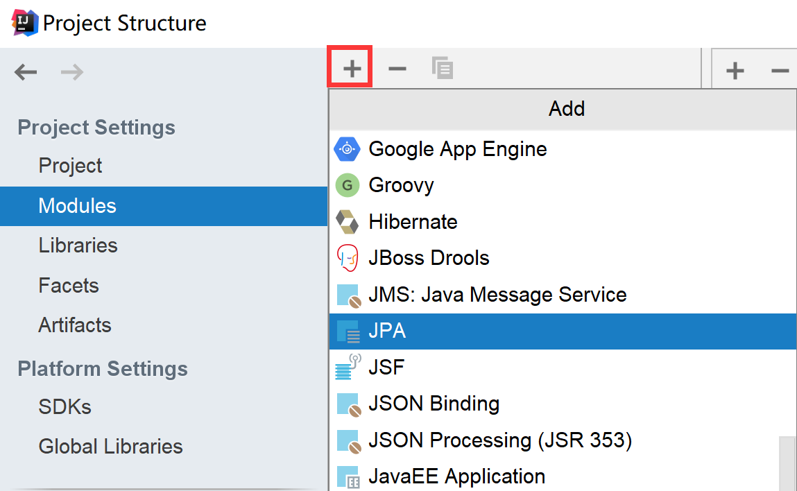 File -> Project Structure -> Modules,点击+号,选择JPA,OK