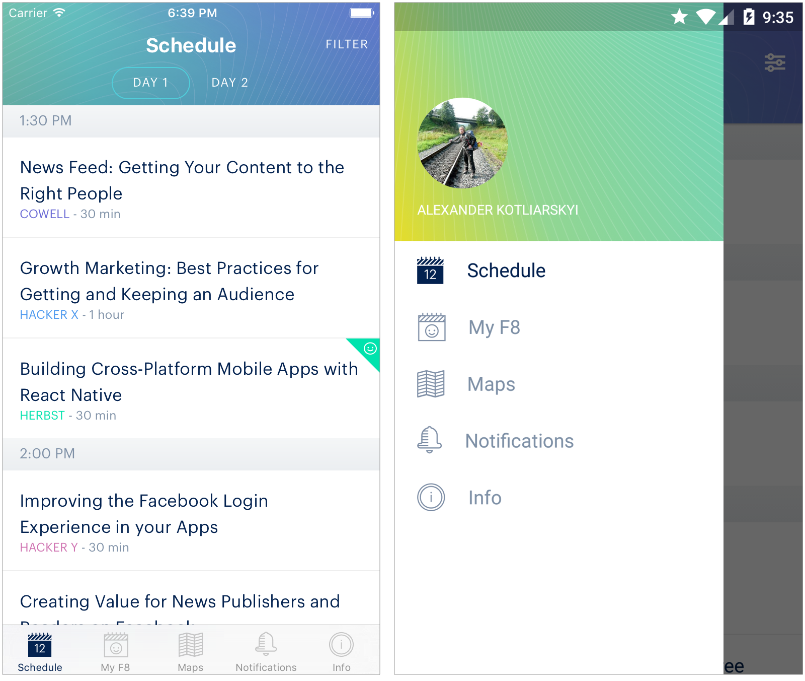 React Native最佳学习模版- F8 App开源了,界面和体验是相当的完美,这个是Facebook官方开发的,所以放在第一位进行推荐。现在在github将近6000个star了。项目地址https://github.com/fbsamples/f8app