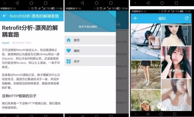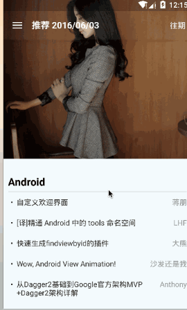 在来一个Gank客户端,这个客户端其实也是大同小异,主要在界面UI实现风格方面有点变化,特别提一点里面的妹纸图缩放以及拖动效果做的还不错的。