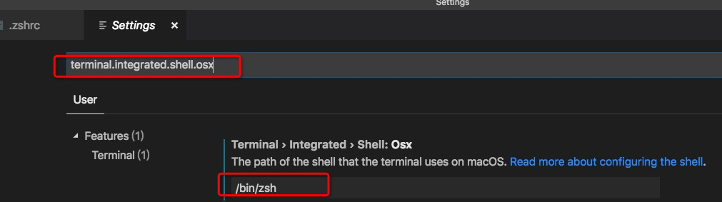 打开vscode-->Code-->首选项-->配置(Settings)-->搜索“ terminal.integrated.shell.osx ”-->改为/bin/zsh-->关闭后重新打开查看当前shell