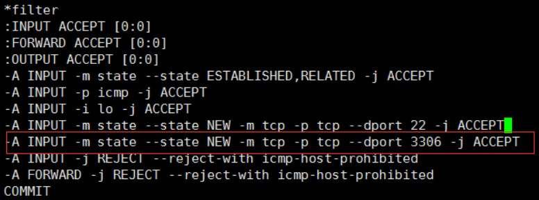 模仿22端口开放命令添加如图所示的一行即表示对外开放3306端口
