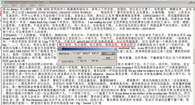 3、随机的验证一下微信好友的签名,再此以小编对象的微信签名为例,她的签名是“得之安然、失之坦然、处之泰然、顺其自然、争其必然!”,之后在TXT文件中进行搜索,可以看到其签名确实是存在里边的,如下图所示。