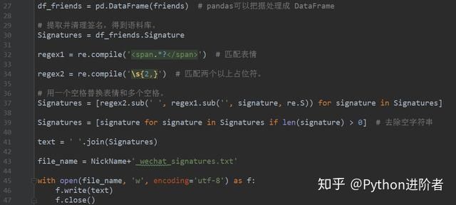 1、代码实现还是基于itchat库,关于这个神奇的库,在之前的文章中有提及, 再次不多赘述。下图的代码的功能是实现签名的抓取和数据提取。之后将抓取到的数据写入到本地文件中去。