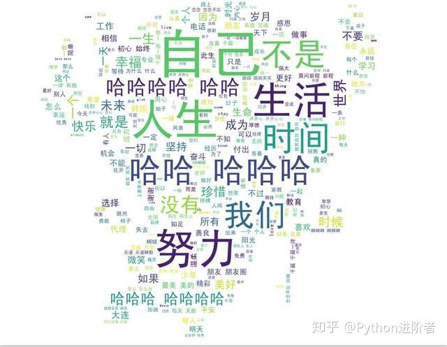 根据词云的可视化效果来看,关键词:人生、努力、时间、我们、哈哈哈……等词语,出现的频率较高。可以感受得到小编的微信好友的签名基本上都突显出积极乐观,珍惜时间,努力奋斗的特征。