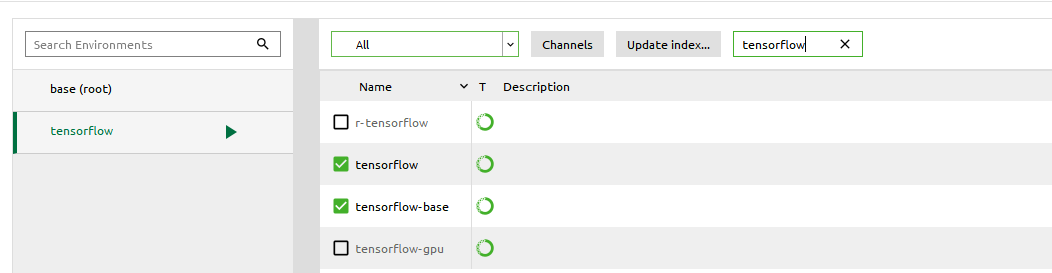 上面是安装tensorflow_CPU的环境,安装GPU环境的话只需要重新添加一个环境,然后搜索tensorflow-GPU即可。