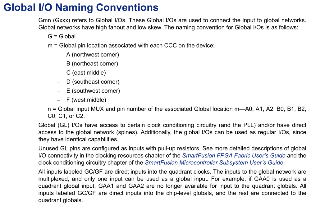 Microsemi FPGA的全局时钟管脚编号,我们可以通过官方Datasheet来找到,在手册中关于全局IO的命名规则上,有如下介绍:
