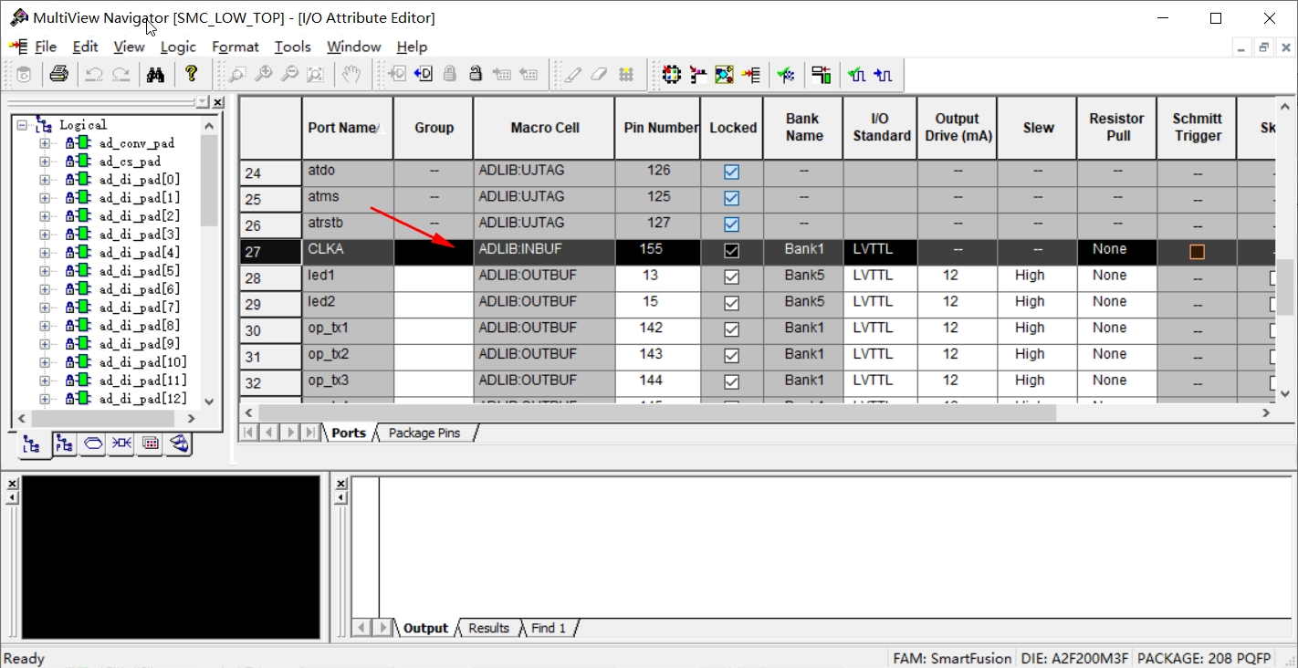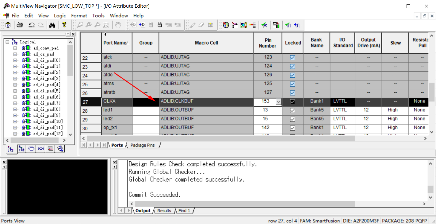 这两种方式都是一样的,添加完成之后,再进行管脚分配,可以看到CLKA已经是全局网络了,只能分配在全局管脚上。