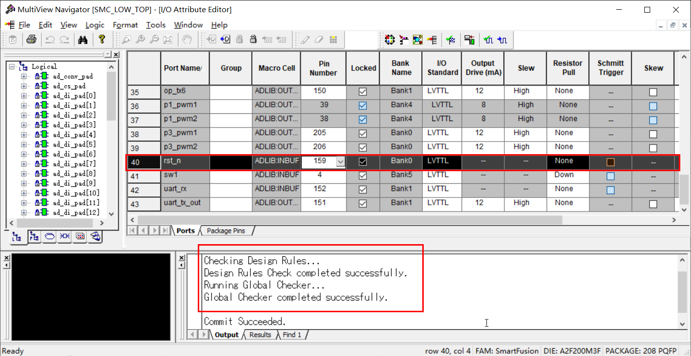 尝试取消引脚锁定LOCK,再次commit检查成功,编译下载正常,但是功能不对,再次打开引脚分配界面,发现是rst_n对应的引脚并不是我设置的那个,看来是CLKBUF的原因。