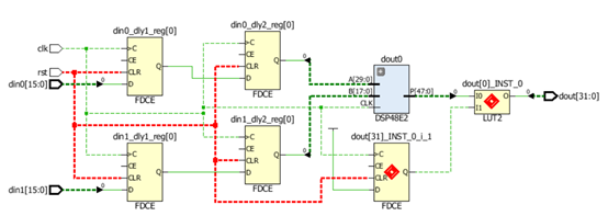 而上图为使用同步复位综合后的结果,上述触发器会完美地映射到DSP48内部,设计对比异步复位的设计具有最佳的资源使用率,更好的性能和更低的功耗,并且逻辑层数也更少。