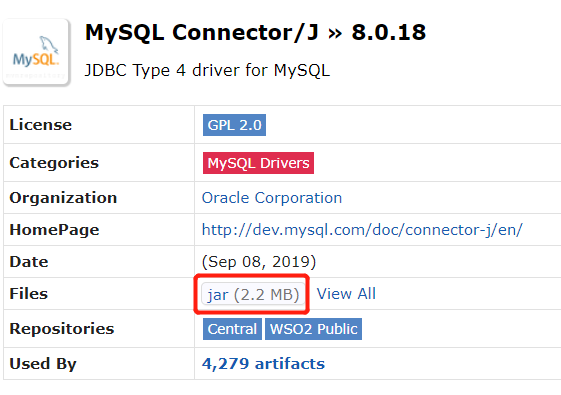 访问 Maven公共库:https://mvnrepository.com/tags/maven ,在搜索框键入 “MySQL”搜索,选择 MySQL Connector/J。可以看到,驱动已经更新到8.0.19了。选择8.0.18。直接点击 jar(2.2M)进行下载jar包。
