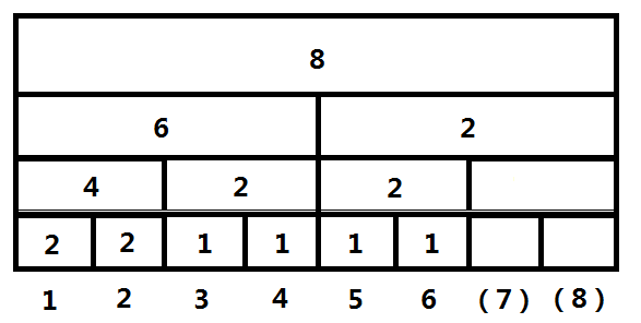 step 1: 区间$[1,4]$内的数一共出现了$6$次,所以我们可以直接进入另一区间$[5,8]$,并且找这个区间中的第$1$小