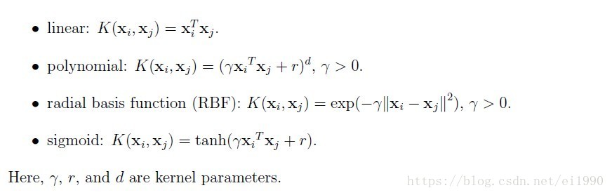 2)对于多项式核函数,有三个参数。-d用来设置多项式核函数的最高此项次数,也就是公式中的d,默认值是3。-g用来设置核函数中的gamma参数设置,也就是公式中的第一个r(gamma),默认值是1/k(k是类别数)。-r用来设置核函数中的coef0,也就是公式中的第二个r,默认值是0。