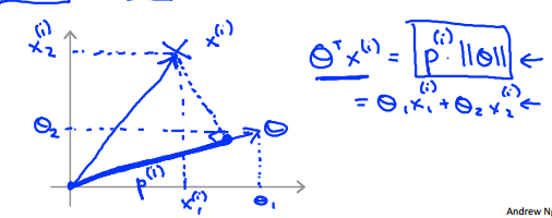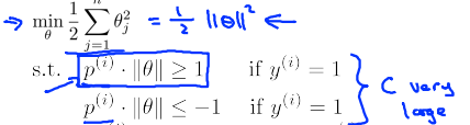 即:如果我们要最小化1/2*∑θj^2,就要使得||θ||尽量小,而当||θ||最小时,又因为 ,所以p(i)最大,即间距最大。