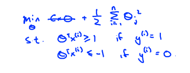 非常有意思的是,在最小化 1/2*∑θj^2的时候,最小间距也达到最大。原因如下: