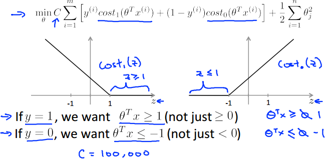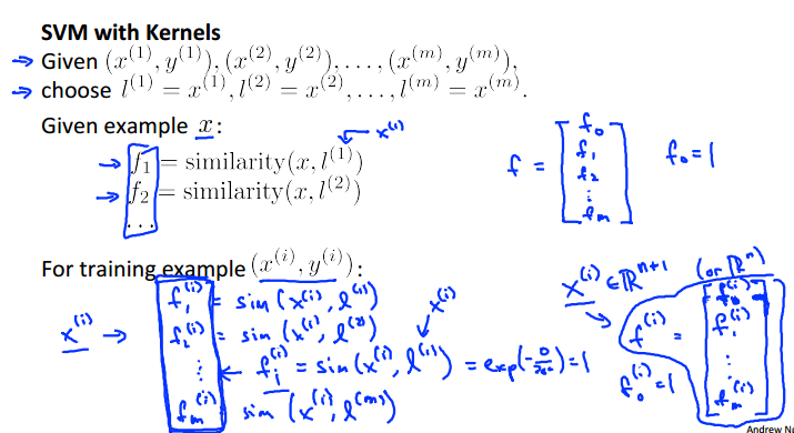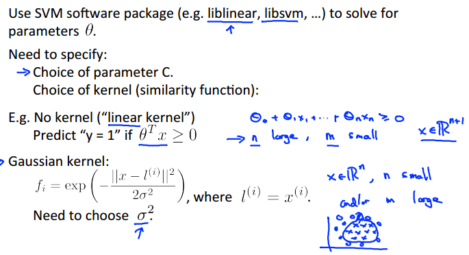 支持向量机较为复杂,一般而言,我们都不会自己去实现算法,而是直接调用。但是我们需要做两点工作,那就是:1.选择C的值(cost function上的那个系数C),2.选择核函数(或者直接使用无核),具体步骤如下: