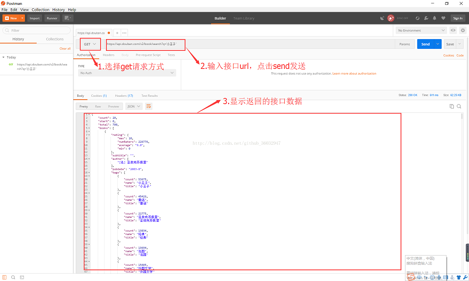 如查询《小王子》这本书的信息,则q='小王子',使用postman工具来试验一下,如下图: