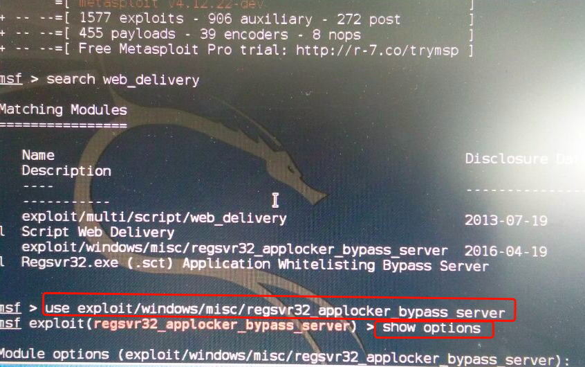 3.使用命令use exploit/windows/misc/regsvr32_applocker_bypass_server,并且查看这个模块选项