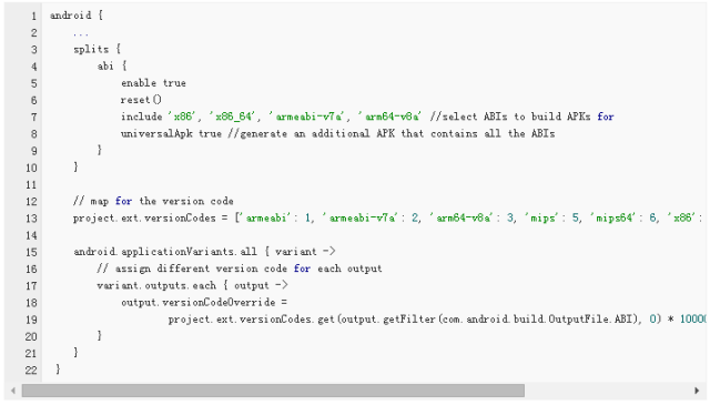 以减少APK包大小为由是一个错误的借口,因为你也可以选择在应用市场上传指定ABI版本的APK,生成不同ABI版本的APK可以在build.gradle中如下配置: